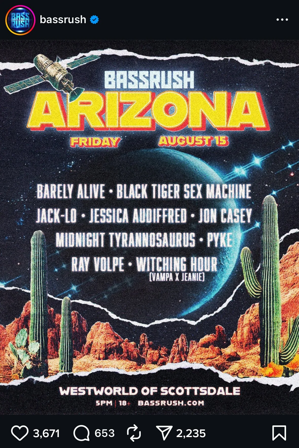 The final identity gave BASSRUSH Arizona a distinct personality within Insomniac’s summer lineup. The layered collage style provided a fresh, analog alternative to the more polished look seen across the EDM space. The rollout received strong engagement, with the lineup post on BASSRUSH’s official Instagram generating over 3,600 likes, 2,200 shares, and 653 comments. The visual system was implemented across all digital and physical platforms, and the shared asset helped tie adjacent campaigns together under one cohesive visual thread.