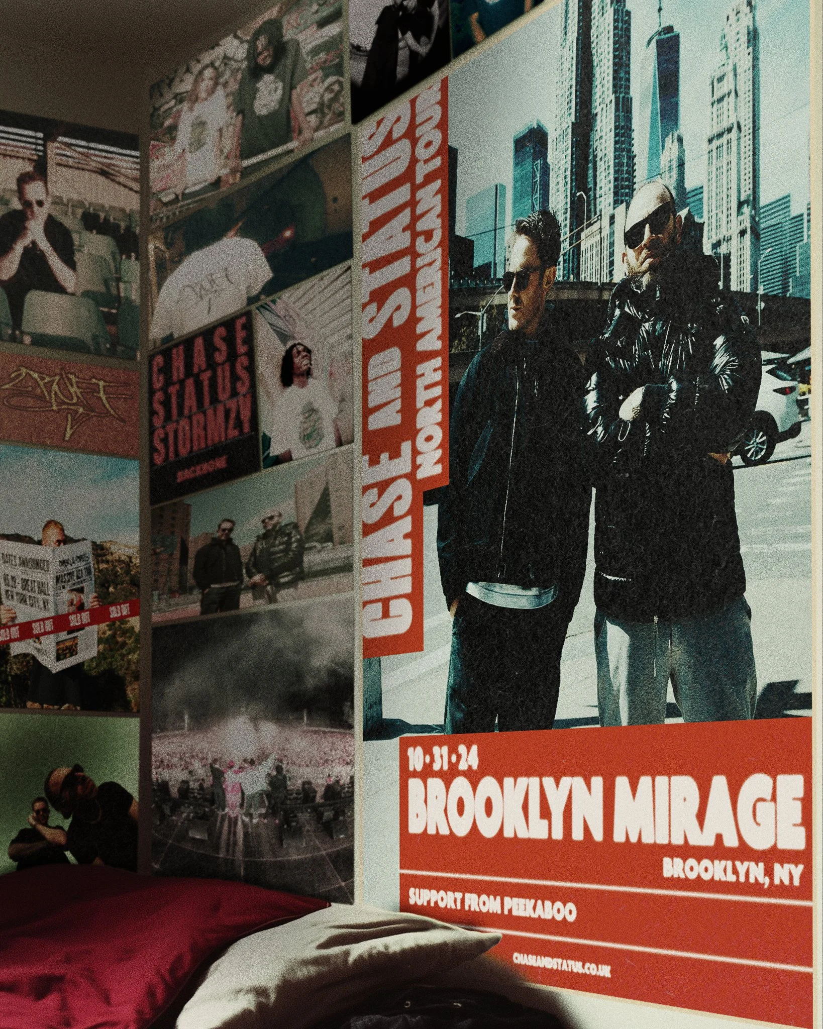 For Chase & Status' North American tour, I led the creative direction for visual branding, designing a range of promotional materials that captured the raw intensity of their live performances. The artwork was inspired by a fan's bedroom covered in band posters, providing an authentic, gritty feel. The challenge was maintaining a consistent visual identity across various platforms while allowing flexibility for different promotional channels.